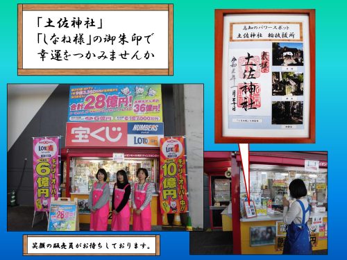 売場の中に開運招福のご福徳を願って「しなね様」の愛称で知られる高知のパワースポット土佐神社のお札を祀り始めてから幸運が始まったとの伝説も…