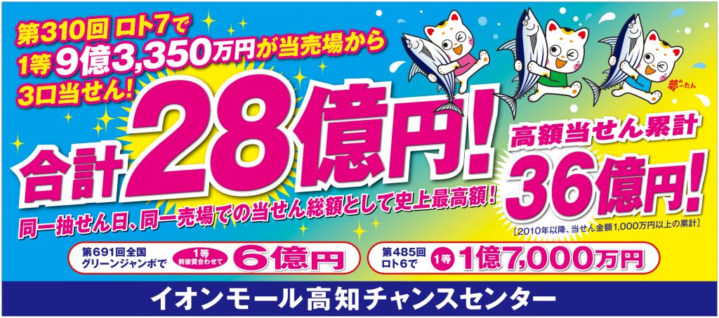 ロト7の1等9億3,358万円×3口、総額28億円(同一抽せん日、同一売場での当せん総額として史上最高額!)を含め2010年から現在までに1,000万円以上の大当たりが累計12本37億円出いている宝くじの聖地!