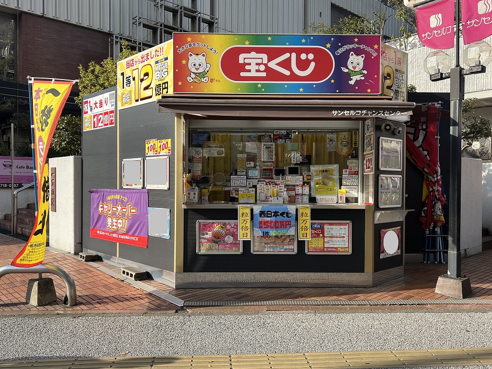 隣接するホテルニューオータニ博多前の広場には、夏になると飾り山笠が立ち、多くの見物客も集まり賑わうサンセルコショッピングセンター前にある宝くじ売場。