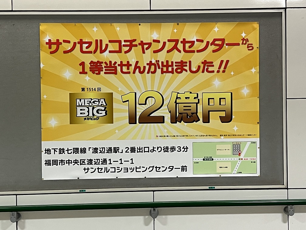 天神と博多を結ぶ渡辺通りに、地域の暮らしを支え福博の賑わいを生み出す、そんな願いが込められたショッピングセンターの一角に売場はあります。山笠と太陽(SUN)の開運パワーで高額当せんのチャンス!