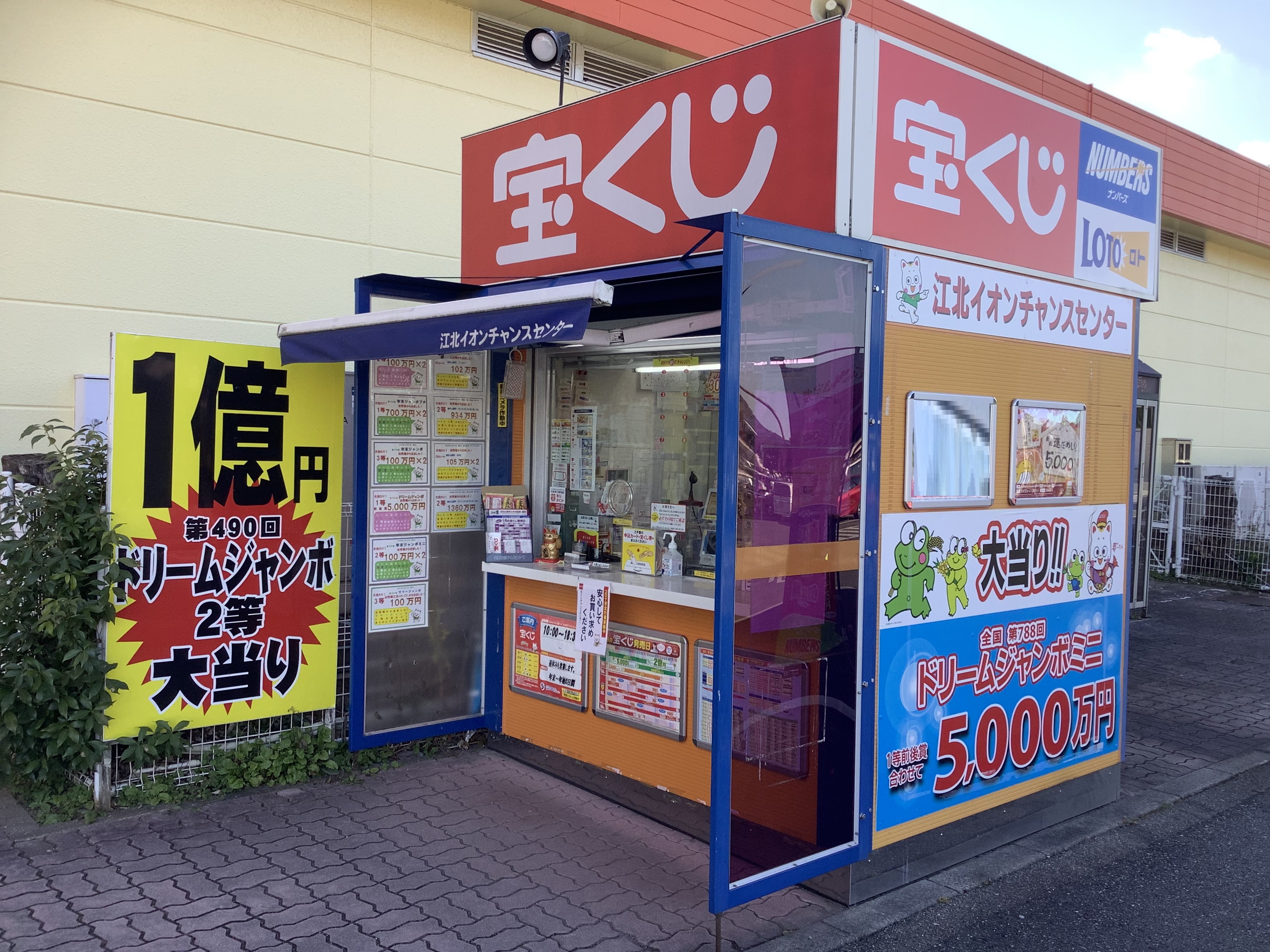 古くは長崎街道の宿場町として栄えた佐賀県の“おへそのまち江北町” 国道34号線沿い イオン江北店の宝くじ売り場で夢も買おう! 国道から見える大当たり看板が目印です! 江北町のイメージキャラクター「へそがえる ビッキー」君もお待ちしております。