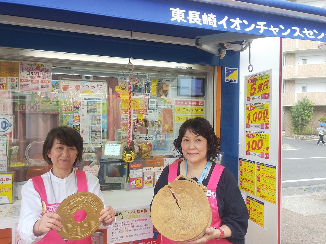 くじ券をヒノキ切り株の上に置き、重しとして五円玉を乗せて保管したところ、見事ジャンボ1等3億円が当せん!!そんな当売場のお客様にあやかり、売場に「ヒノキ切り株」&「五円玉」をご用意しています!!!