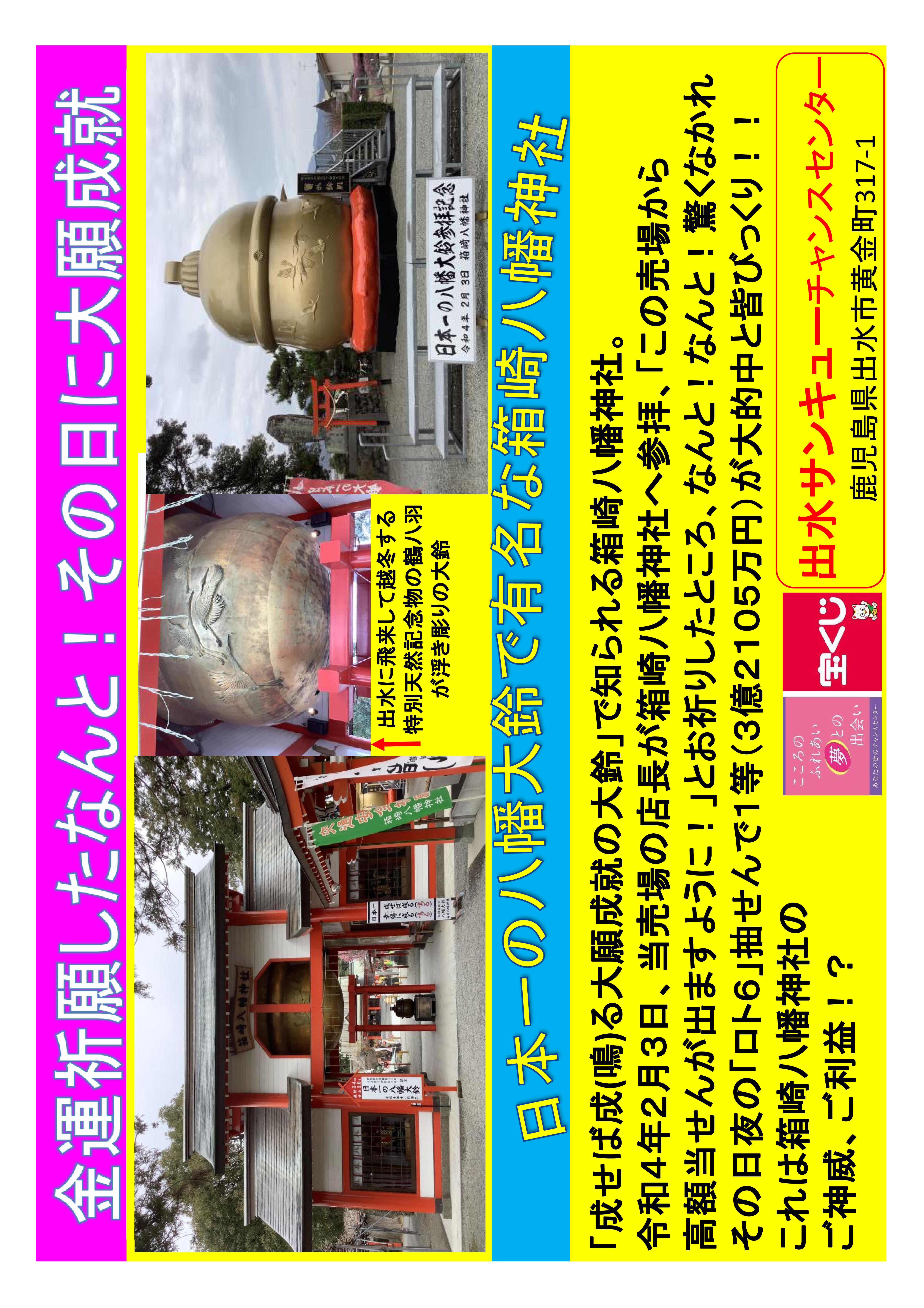 当チャンスセンターから車で5分の箱崎八幡神社は日本一の大鈴(高さ4m、直径3.4m、重さ4トン)があることで有名。大鈴は「成せば成る(鳴る) 大願成就の大鈴」と言われ金運アップ、商売繁盛のご利益があるパワースポットとなっています。また、出水市は鶴の往来でも有名な場所。鶴は長寿や繁栄のシンボルで縁起の良い鳥と言われています。