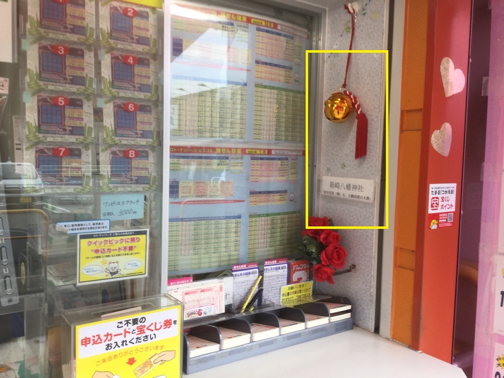 実のところ、2022年2月3日当売場の店長が売場訪問後に箱﨑八幡神社を参拝し「この売場から高額当せんが出ますように!」とお祈りしたところ、なんと!なんと! その日の夜の「ロト6」抽せんで1等(3憶2105万円)が大的中!奇跡にも近いこの出来事に皆びっくり!! これは箱﨑八幡神社のご神威、ご利益!?