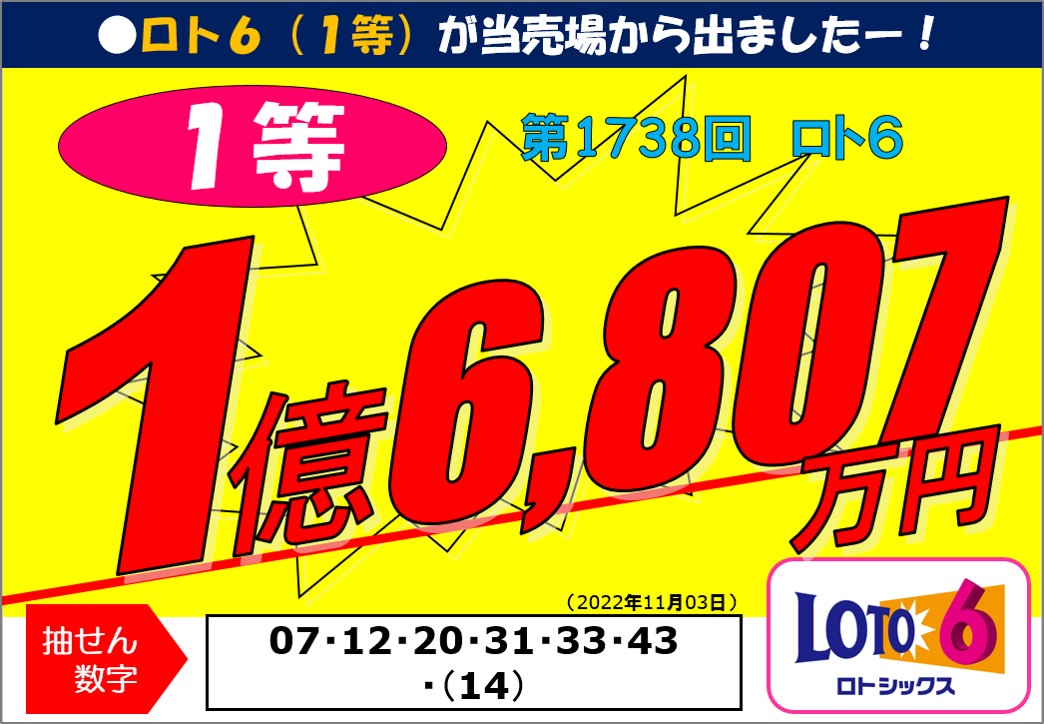 令和4年ロト6第1738回の1等1億6,807万円など大当たりが続出している売場です。