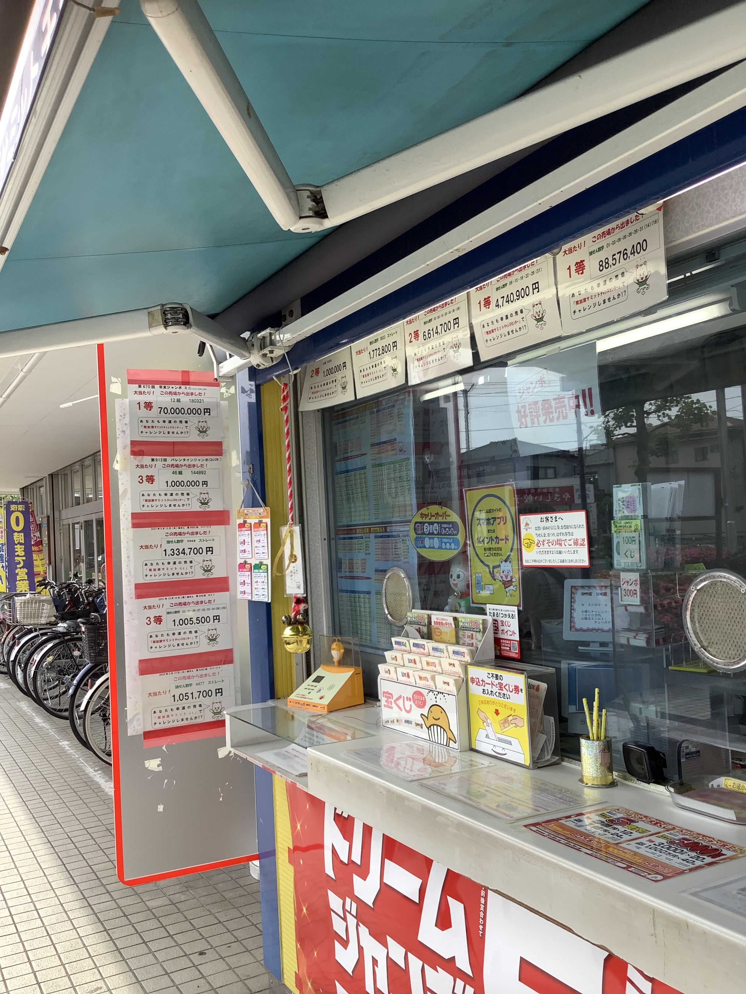 当売場は川崎市幸区の南側鶴見川にかかる末吉橋に近く、主要幹線道路県道14号線(尻手黒川道路)に面したスーパー南加瀬サミットさんの正面にあります。同スーパーは地域の台所として大変な繁盛店で当売場も買物客や車利用の多くのお客様にご利用いただいています。古くは2010年の年末ジャンボで2等1億円の当せんがあり、その後も100万円を超える当せんが数多く出ています。近くでは2021年10月ロト7 1等88,576,400円も出ました。どうぞ次の大当たりを目指しチャレンジしてみてはいかがですか。