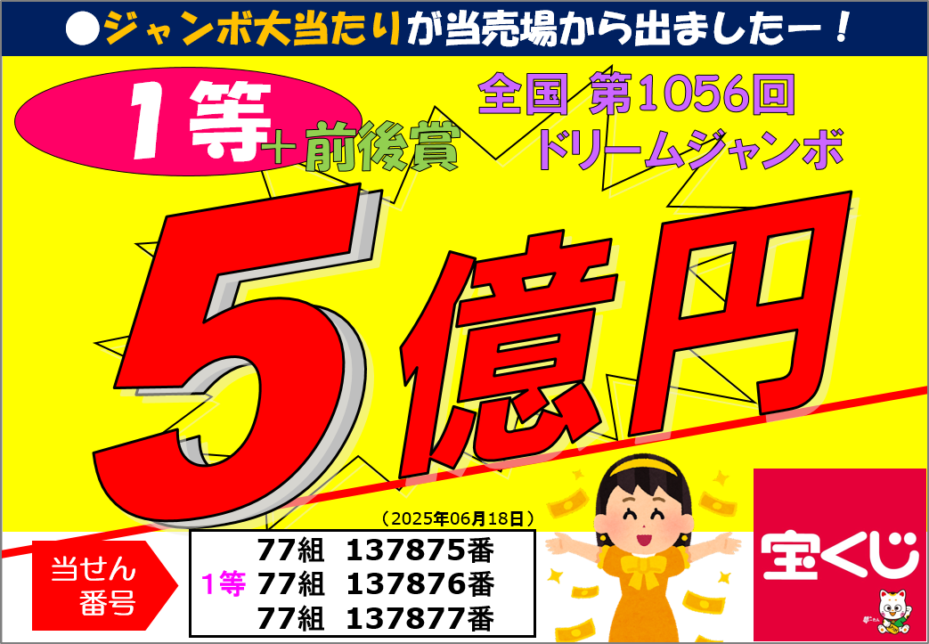 今後、本売場でも高額当選が期待される。 皆さまのご来店をスタッフ一同お待ちしております。