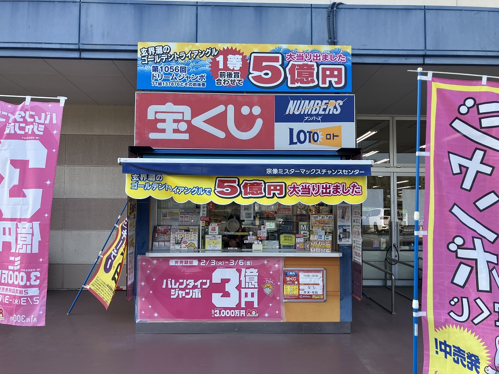 宗像ミスターマックスチャンスセンターは、宗像市石丸のミスターマックス宗像店にあり、世界遺産「神宿る島」宗像・沖ノ島と関連遺産群に登録された宗像神社にも近い宝くじ売り場であり、宗像地区で世界遺産登録時のサマージャンボミニ1等7千万、ミニ1等1億円、サマージャンボ1等7億円が連続して出ており、