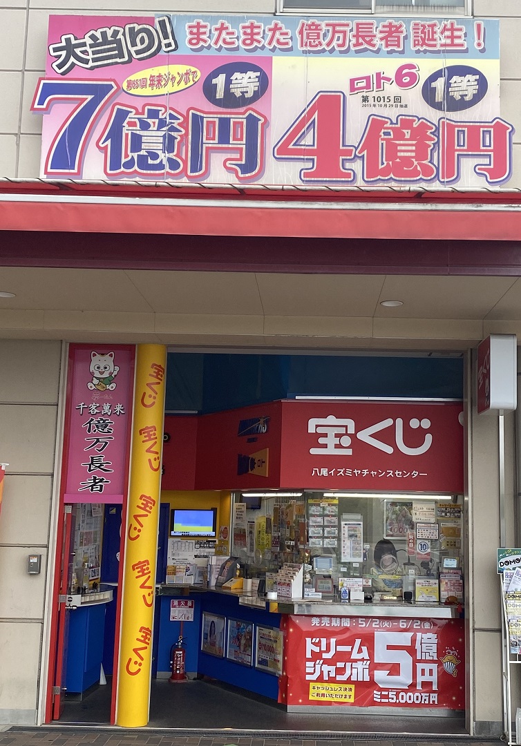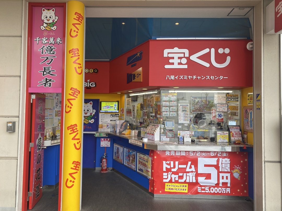 スーパー「イズミヤ八尾店」の駐車場にある売場で、大阪南部にある百舌鳥・古市古墳群の世界遺産エリア『ゴールデントライアングル』内にある売場の一つです。日本有数の金運パワースポット地帯『ゴールデントライアングル』では、2015年以降、1億円以上の当せんが合計24本、累計107億円に上っています。