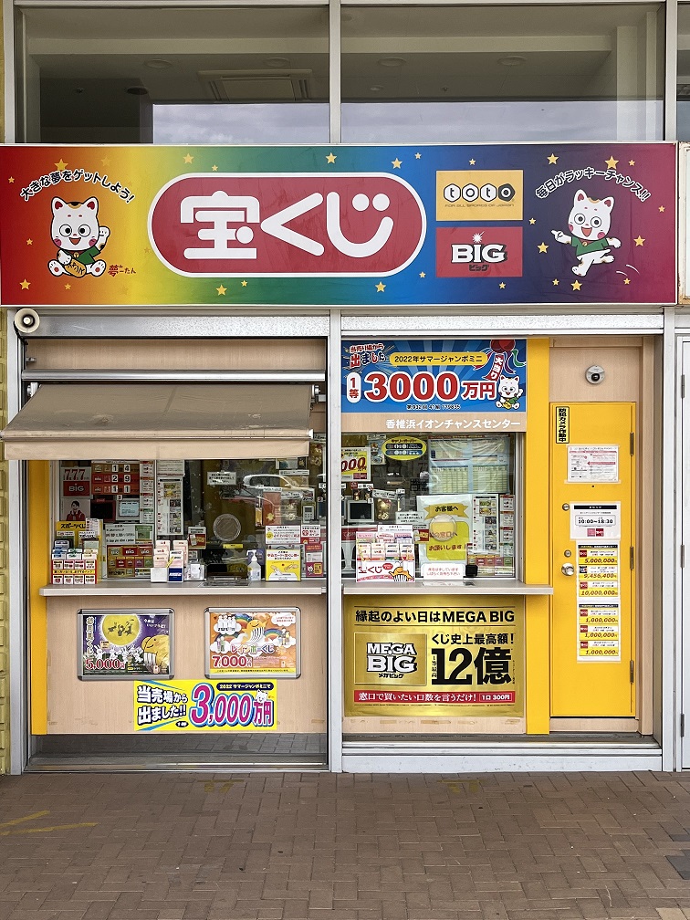 福岡都市高速、香椎浜ICから車で3分、県道1号線沿いのイオンモール香椎浜店にある宝くじ売場です。近くには、開運のパワースポットで有名な香椎宮があります。桜門越に見る鳥居は『開』という字を表し、門をくぐって、吽形(うんぎょう)の狛犬に触れれば『運』を表す。 まさしく『開運!』 本殿で高額当せん祈願すれば、あなたも高額当せん間違いなし?!皆さまのご来店をスタッフ一同お待ちしております。