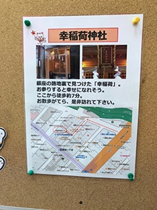 京橋は、日本橋と銀座のちょうど真ん中に位置してします。当売場から徒歩7分ほどの場所、銀座1丁目の路地裏で「幸稲荷神社」を見つけました。名前を聞いただけで何が良いことが起きそうな気がします。是非お散歩がてら訪れて下さい。