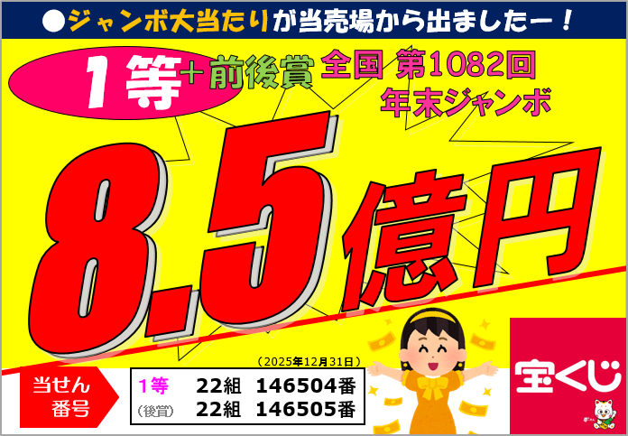 2022年「年末ジャンボ」で1等・後賞合わせて8億5,000万円の大当たりが出たほか、3等の100万円が1本。同じく「年末ジャンボミニ」では2等が6本と、当たりが出るわ出るわ・・・。