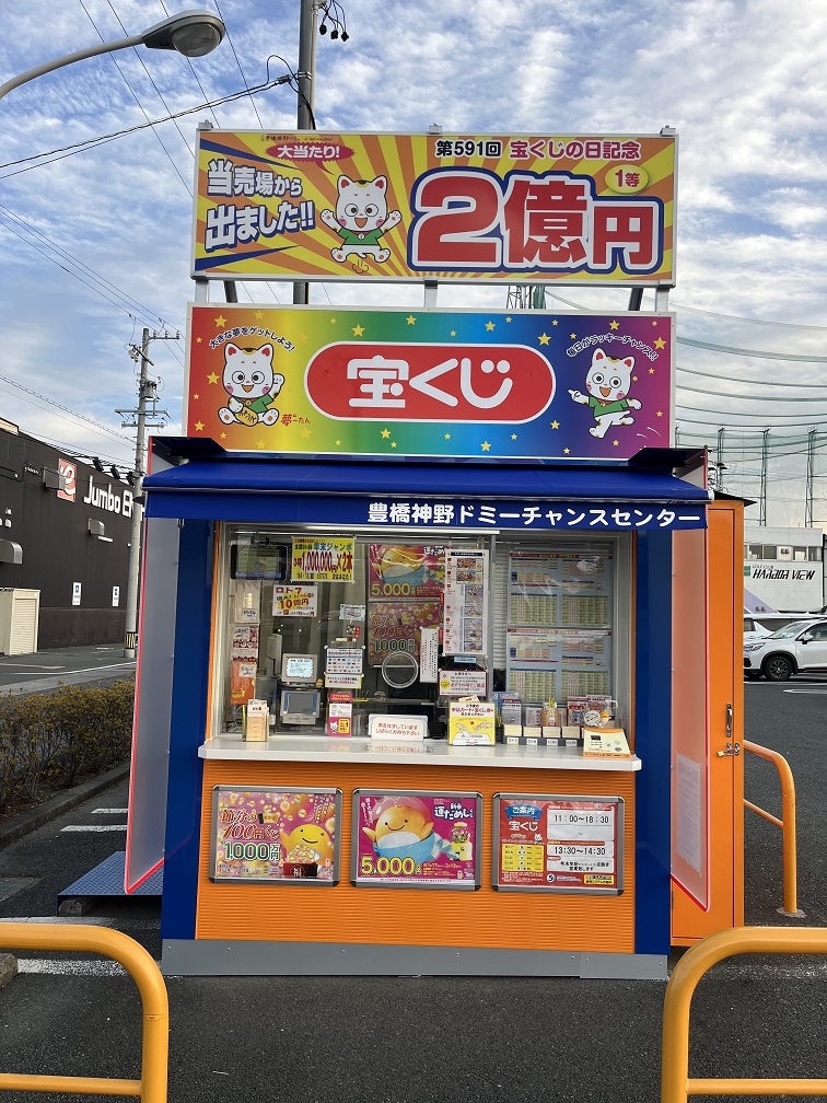 豊橋駅から北西約5キロ県道3号線沿いにある宝くじ売場は、2億円の大当たりも出た幸運の売場です。神野新田は1893年(明治26年)実業家の神野金之助が、巨額の費用を投じて新田・用水の修復にあたった干拓地で約1100haの広大な地域です。自然災害も多い中、開拓の人々の様々な苦労・工夫、そして情熱で完成した神野新田の歴史を後世に語り継ぐ為、近隣には神野新田資料館があります。先人達の歩みを学びにお越しの際は、少し足を延ばして宝くじ売場にもお越しくださいませ。