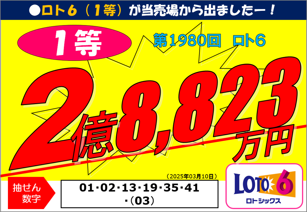 この売場から誕生した100万円以上の大当たりは2015年以降でなんと39本の15億円以上!2019年にはロト7で1等10億円、2025年にはロト6で1等2億8,823万円、その翌日にミニロト1等1,247万円の2日連続大当たり!