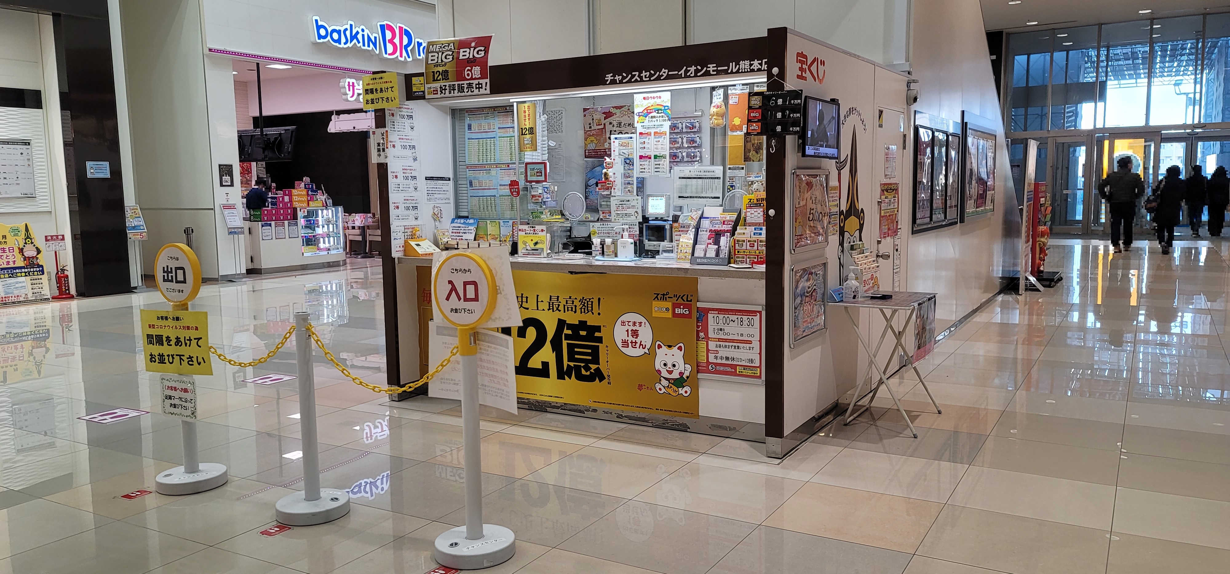 当売場は熊本市内より266号線浜線バイパスを南へ30分、イオンモール熊本のインショップです。1階インフォメーションそばのエスカレーター下にある売場は施設の中央付近に位置し、天候に左右されることなく楽しめますよ。平日はロト・ナンバーズ・スポーツくじをお求めの常連のお客様で賑わい、休日はご家族連れでスクラッチで盛り上がるお客様に多くご来店いただいてます。スクラッチを楽しんでいただけるよう専用のテーブルを完備。開運グッズには幸運の金のスクラッチ削り棒をご用意しています。ぜひスクラッチと一緒にご購入いただき大きな当たりを引き当てて下さい!(^O^)/