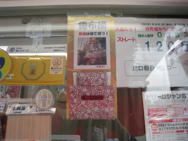 当売場は、ヤオコー川口朝日店駐車場にある宝くじボックスです。売場には、億万長者が誕生するようにと願いを込めた「億布団 果報は寝て待つ!」を設置し、お客様に高額祈願をしていただいております。皆様のご来店を心からお待ちしております。