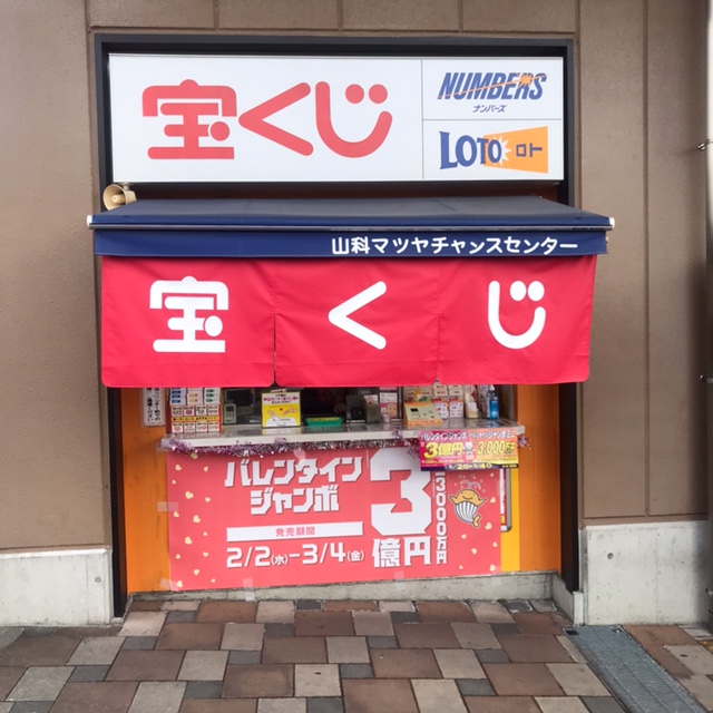 ・電車でお越しのお客さまはJR「山科駅」、地下鉄東西線「山科駅」から徒歩約10分、お車でお越しのお客さまはJR山科駅から府道116号沿い南に約700mにある「マツヤスーパー山科三条店」の入口横に位置するチャンスセンターです。