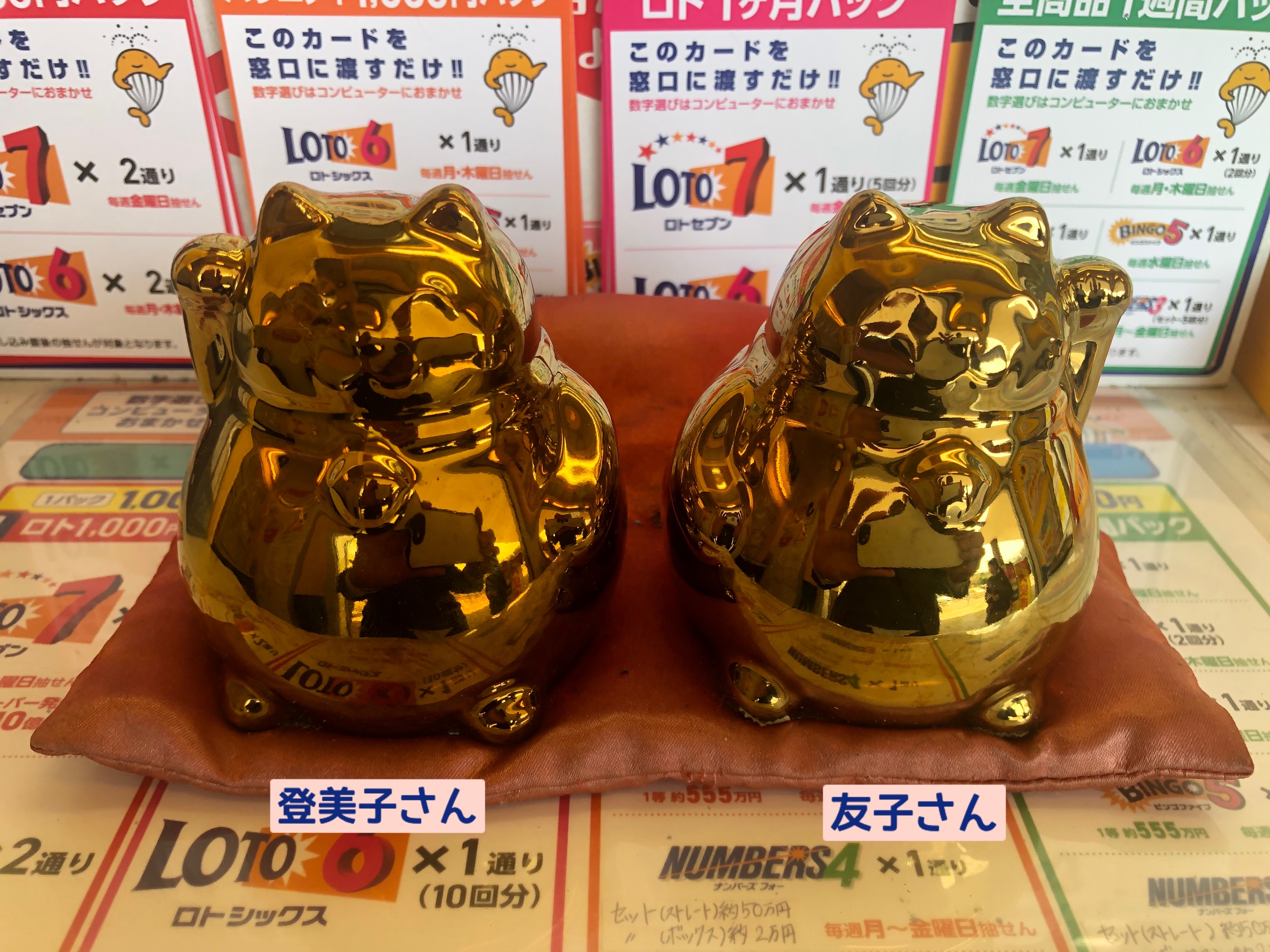 お客さまが宝くじを購入された後、登美子さんと友子さんにくじ券をペタペタさせて大当たりを祈願される姿も多く見られるなど今では人気の看板娘となっています。