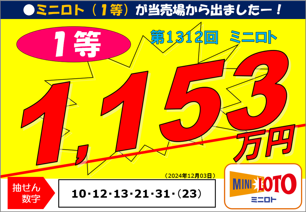 2024年11月 ミニロト(1312回) 1等 11,538,300円が大当たり!