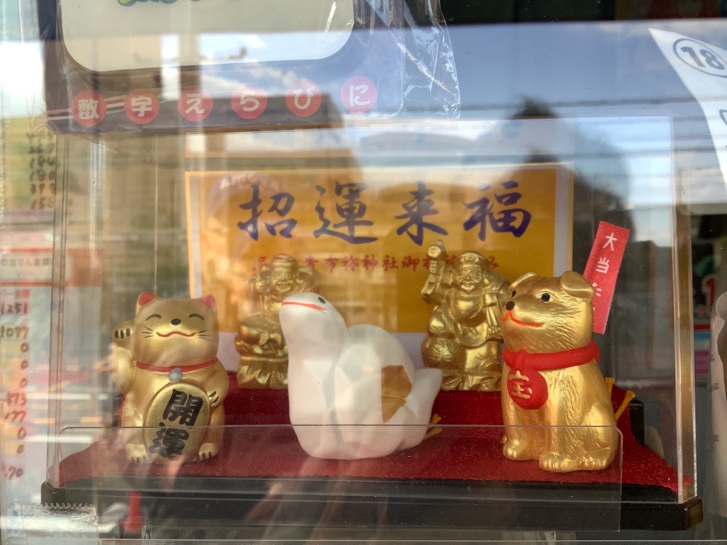 当売場は尼崎市内11あるチャンスセンターの1つです。市内各チャンスセンターでは「尼崎の総氏神」である「貴布祢神社」で祈祷して頂いた「招運来福5点セット〔ちっちゃな恵比寿さまとちっちゃな大黒さま・小判付招き猫・金運の白ヘビ・あたり犬〕がお客さまをお迎えしております。