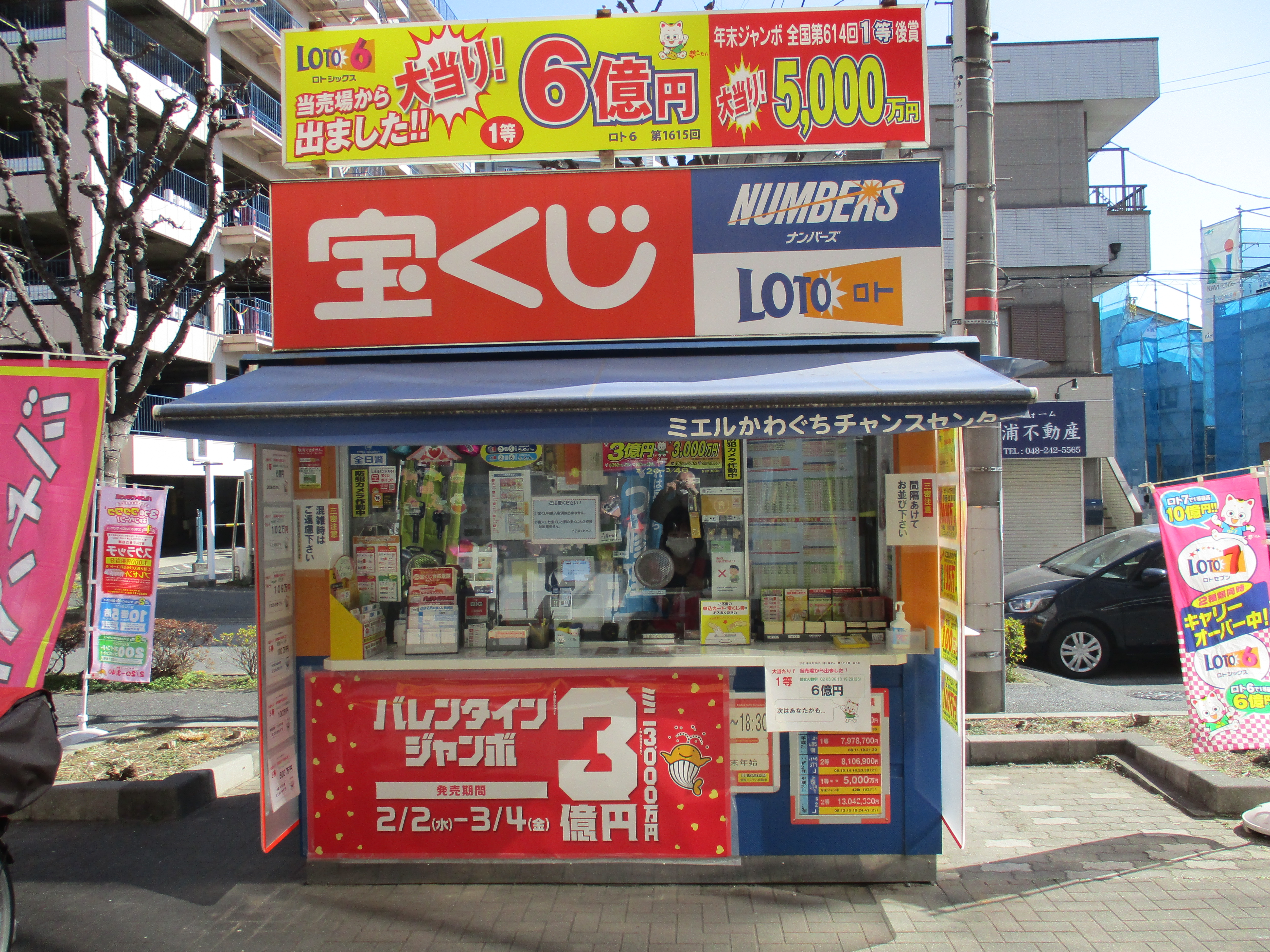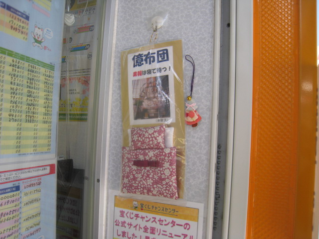 当売場は、商業施設「ミエルかわぐち」マクドナルド前の歩道にある宝くじボックスです。売場には、億万長者が誕生するようにと願いを込めた「億布団 果報は寝て待つ!」を設置し、お客様に高額祈願をしていただいております。2021年にはロト6の1等6億円が出ました。皆様のご来店を心からお待ちしております。