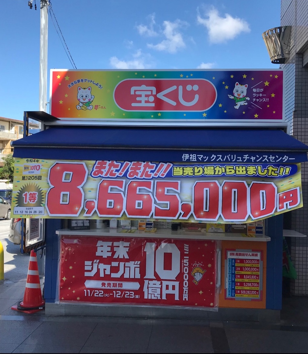 かつて琉球の王都として栄えた浦添市伊祖にある マックスバリュ伊祖店入口横にあります。高額当せんが次々と出ているこの売場の近くは東京ヤクルトスワローズの春季キャンプ地として知られています。連日行列で賑わう人気の沖縄そば屋や某テレビで一躍有名になったチキンの丸焼き専門店もすぐ近くにあります。
