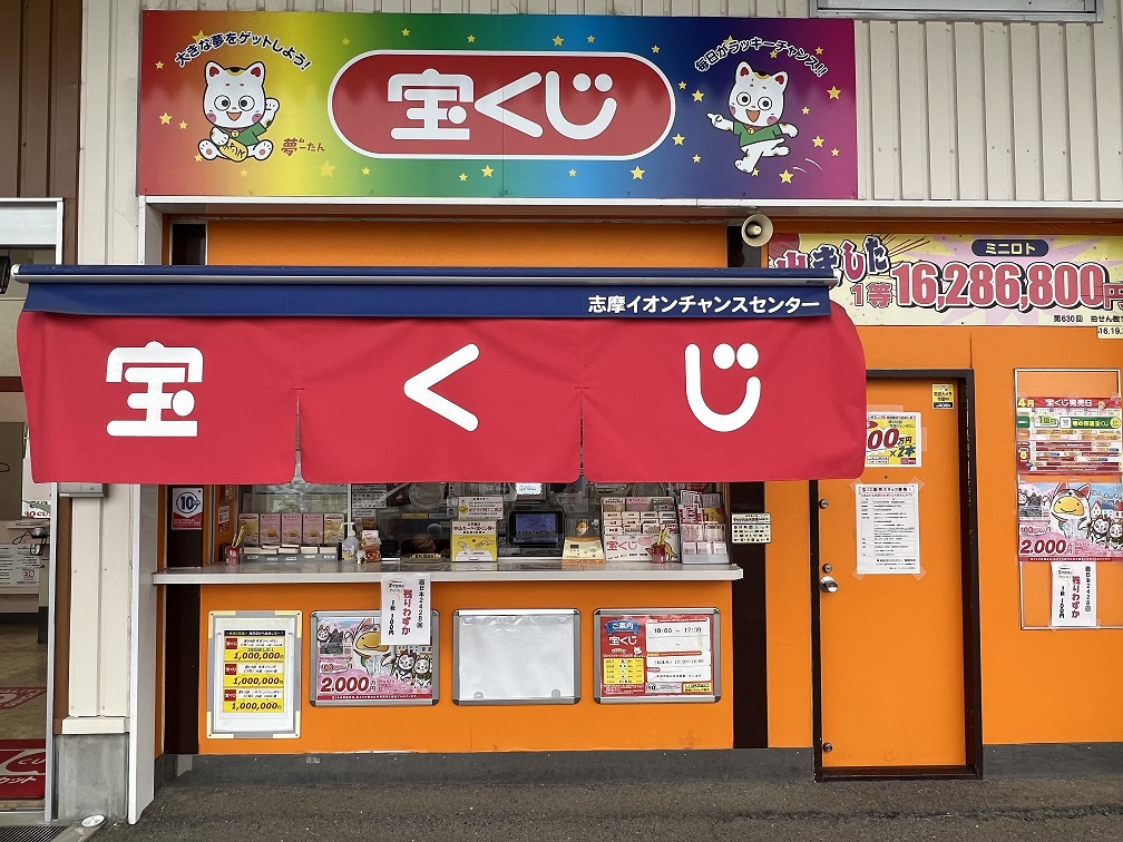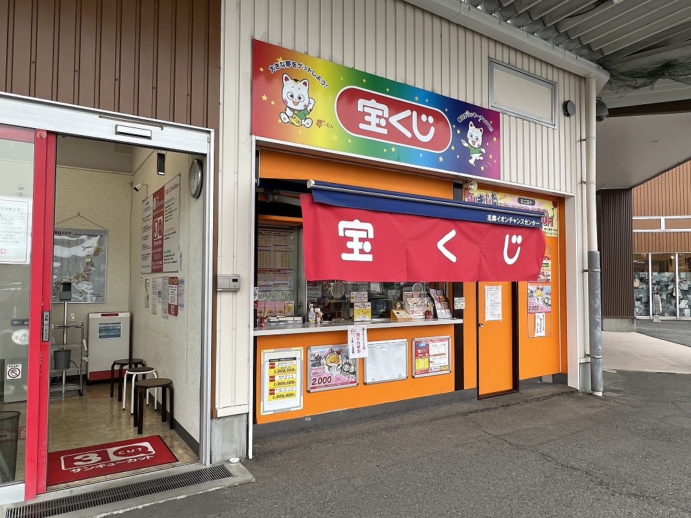海と山に囲まれた自然豊かで神が宿ると言われる糸島市のイオン糸島店入口横にある宝くじ売場です。