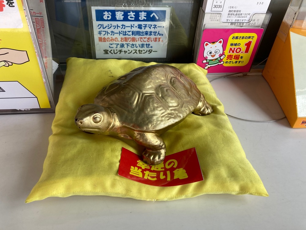 武蔵野カントリークラブ豊岡コースのすぐそば、入間イオンの正面入り口すぐ左に当売り場があり「幸運の当たり亀」と一緒にご来店をお待ちしております。