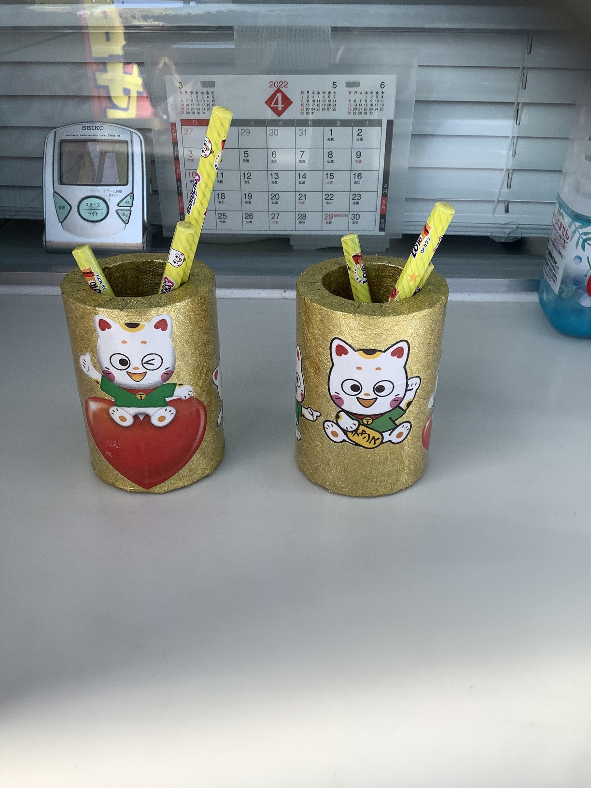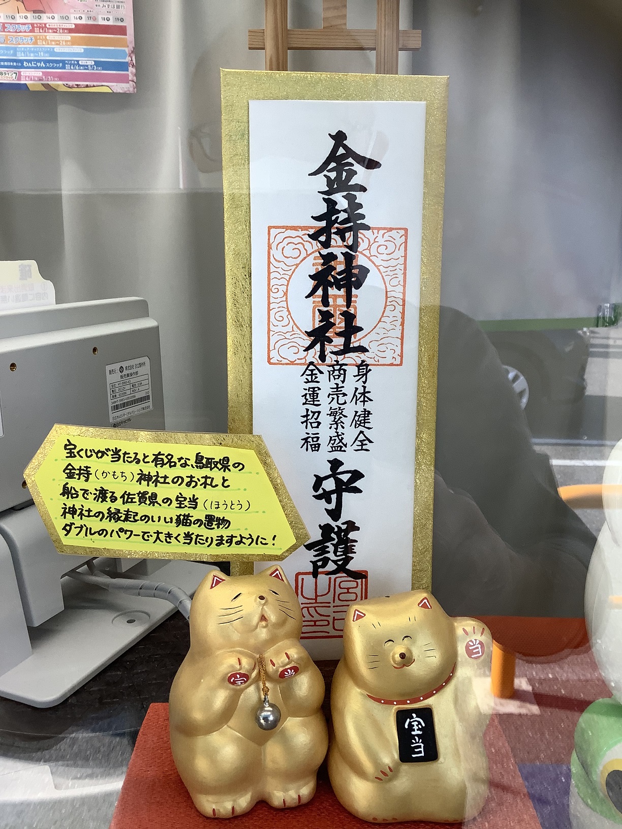 売場には二つのラッキーアイテムを組み合わせて神棚風に手作りした、鳥取県で有名な金持(かもち)神社のお札と、佐賀県で有名な宝当(ほうとう)神社の猫の置物、そして「夢~たん」を貼った黄金の鉛筆立てを用意してご来店されたお客さまの当せんを祈願しております。