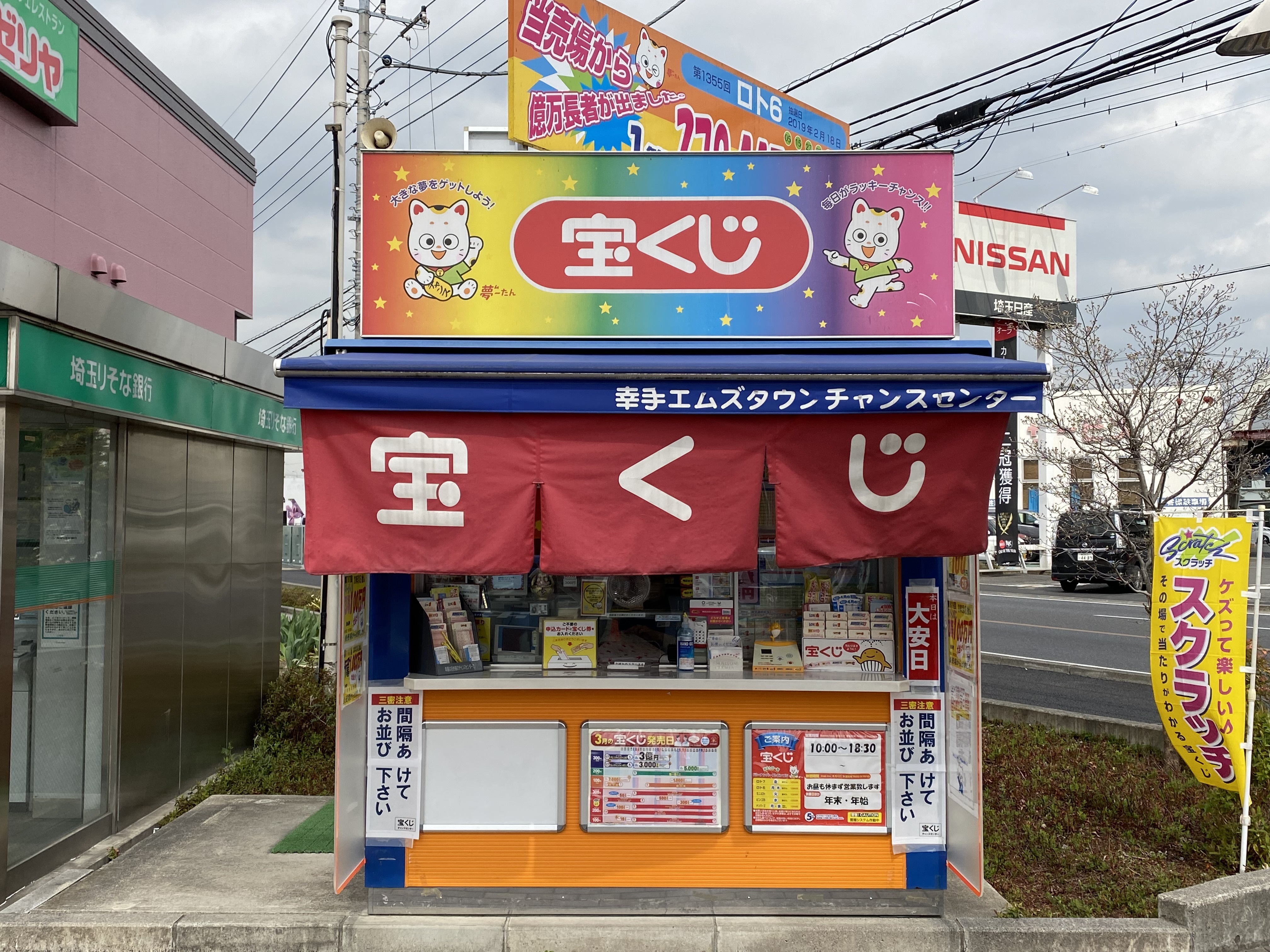「幸せな手」と書く「幸手市」のパワースポット、「幸せの宮」と呼ばれる「幸宮神社(さちのみやじんじゃ)」を参拝し宝くじを購入すれば幸せが舞込むかも、売場では笑顔の販売員が皆様のお越しを心よりお持ち致しております。