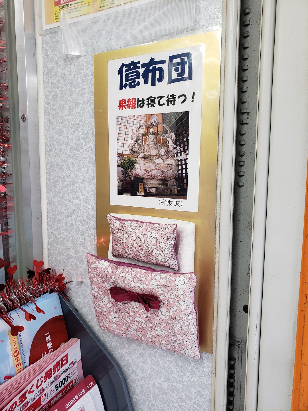 『果報は寝て待て』と言われます。売場には、億円台の当せんが当たりますようにと『億布団』を掲げております。是非、皆さま方に高額当せんが当たりますようにと心からご来店をお待ちしております。是非お立ち寄りください。