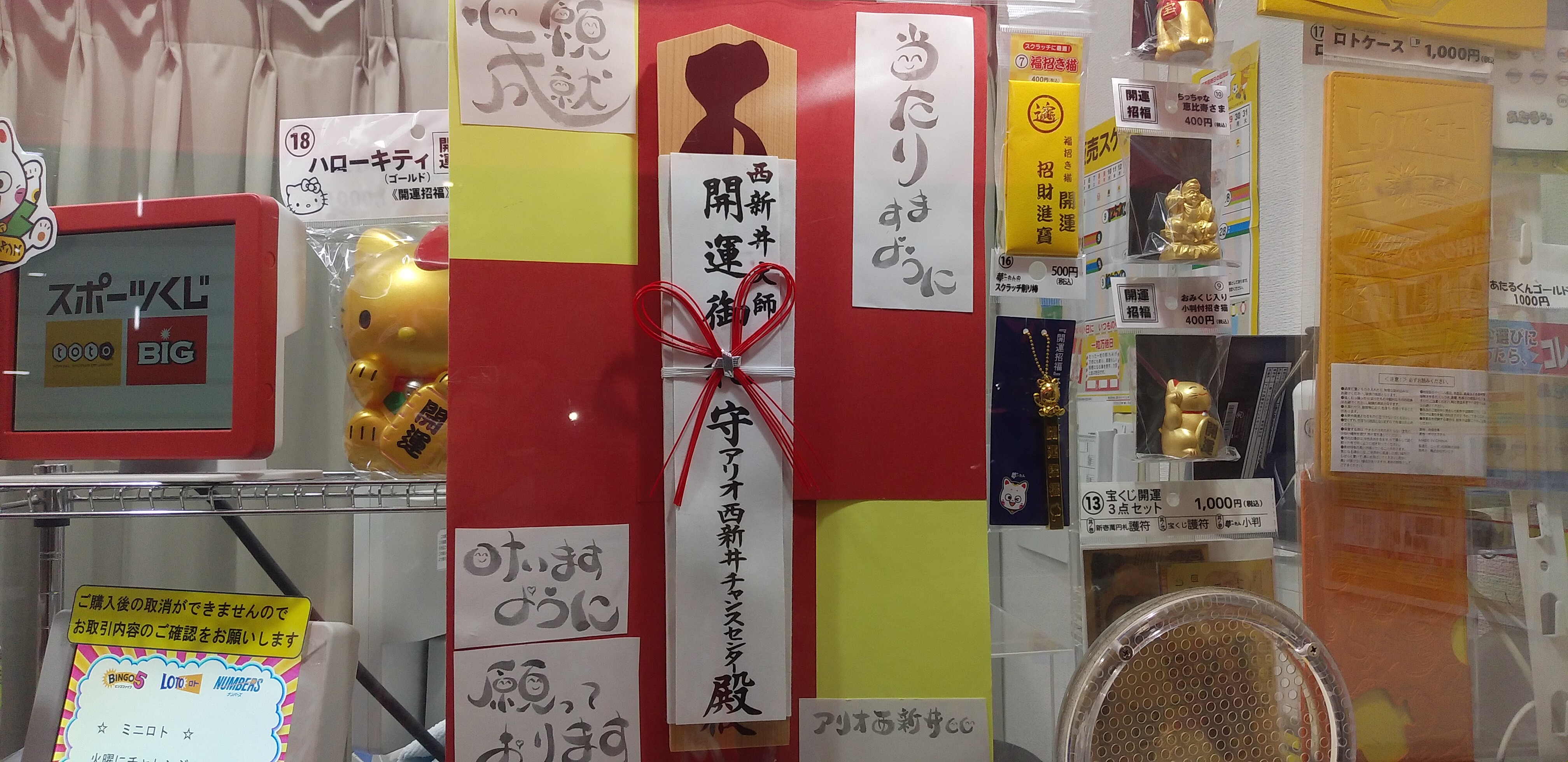 溢れ出る湧き水のように、大当たりが湧き出ることを祈念して、売場には西新井大師で開運祈願を受けた護摩札を飾っております。