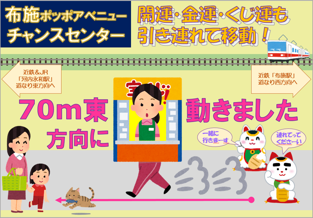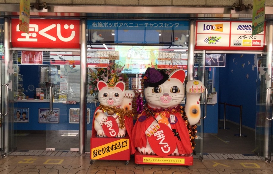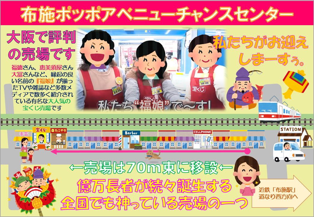 2023年10月27日(金)移設オープン致しました(^^)/パワーアップし皆さまに幸運と夢をお届けいたします。招き猫の「ふーちゃん、夢(む)-くん」が皆さまをお出迎えいたします!皆さまのご来店を心よりお待ちしております。※宝くじ売場には駐車場がございません。公共交通機関をご利用のうえお越し下さいm(_ _)m