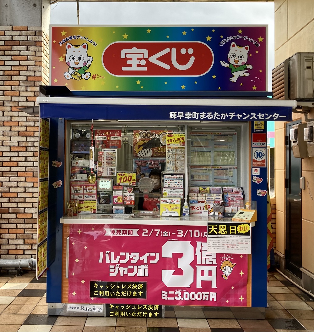 諫早幸町まるたかチャンスセンターは、縁起の良い地名 諫早市幸町にあります。1等前後賞10億円が出た大村イオンチャンスセンターも大村市幸町。。。 大当たりの予感がします!!