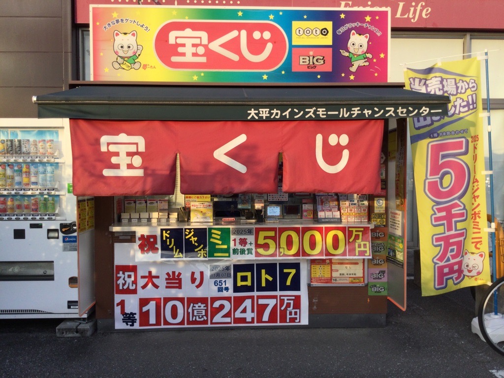 大平カインズモールチャンスセンターは、宝くじ・ロト・ナンバーズ・ビンゴ・スポーツくじを取扱いしてます。大平地区は、2019年の台風19号で被災し当売場も流される寸前、電線1本でつなぎ止められました。その強運を持って、笑顔で皆さまのご来店お待ちしております。