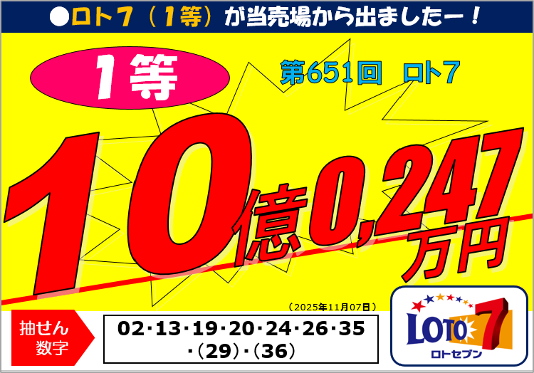 2025年 第651回ロト7 1等10億247万3,400円