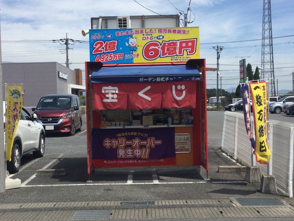 群馬県前橋市の東部にあるショッピングセンター「ガーデン前橋」の北側駐車場東角、マクドナルド近くにある宝くじ売場です。大きな高額当せんがたくさん出ている『知る人ぞ知る売場』です。2018年のいい夫婦の日の11/22にロト6で1等・2億4925万1400円の高額当せんが出ました!!