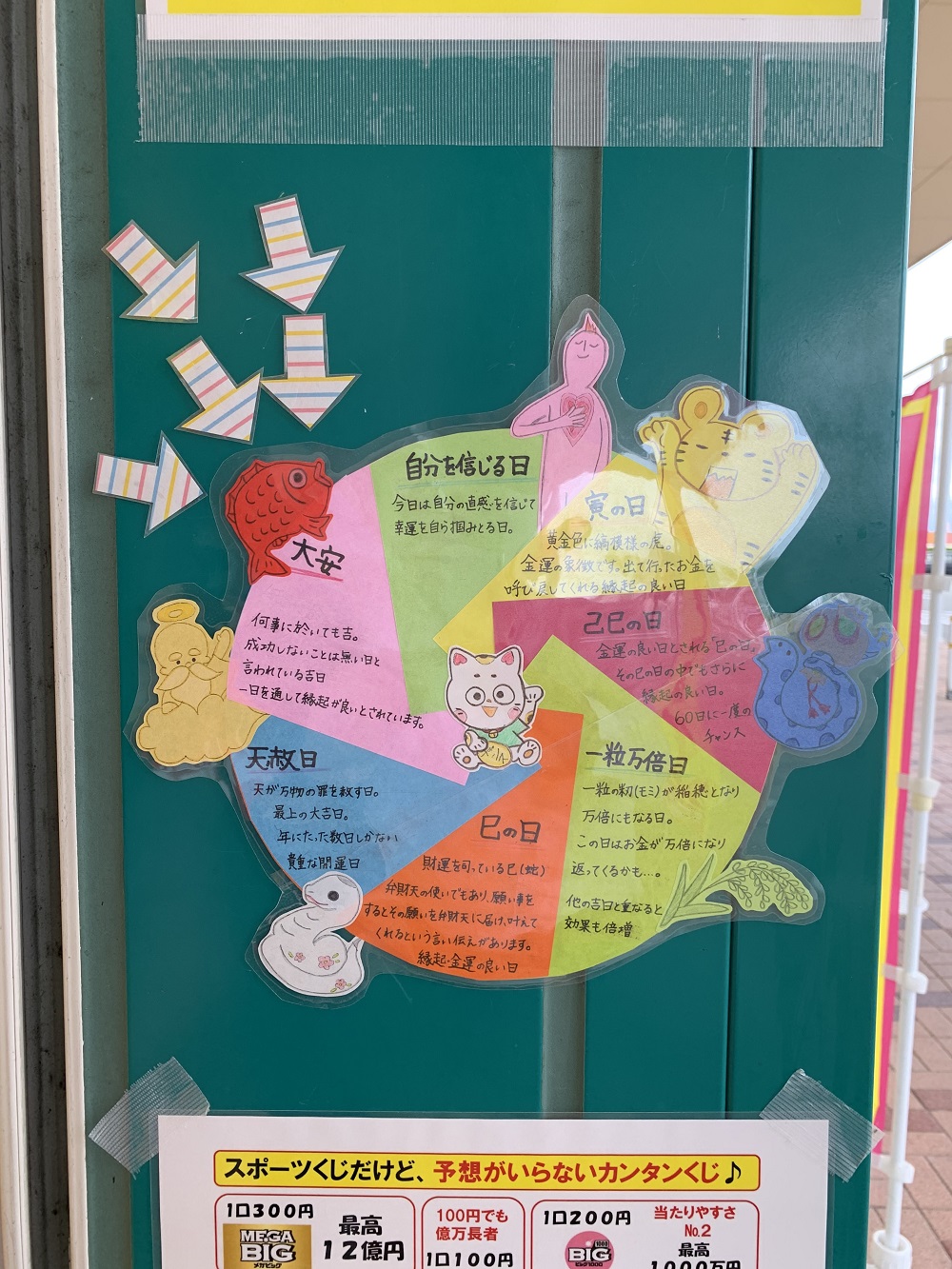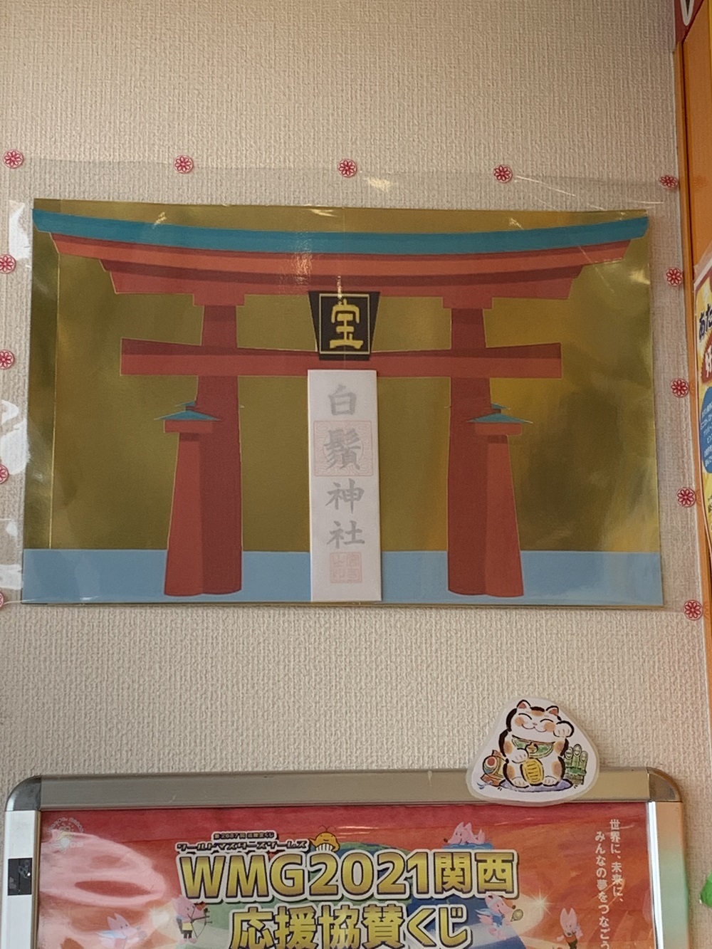 売場最寄りにある「白髭神社」は琵琶湖の水面に建つ鳥居が観光名所となっています。売場ではその鳥居とお札を掲示してあるほか、その日の運気がわかる開運ルーレットでお客さまの大当たりを祈っております。