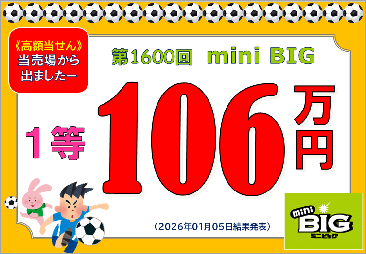 2020年の年末ジャンボミニで、1等前後賞合わせて5,000万円が出ました!次は「億」への期待が高まります。スポーツくじ(toto・BIG)もお取扱いしております。