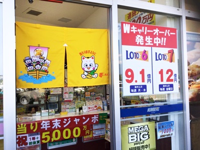 売場入口には大きなWキャリーオーバーボードがあり、外からでもロト6・ロト7がどの位キャリーオーバーしているか一目でわかります。