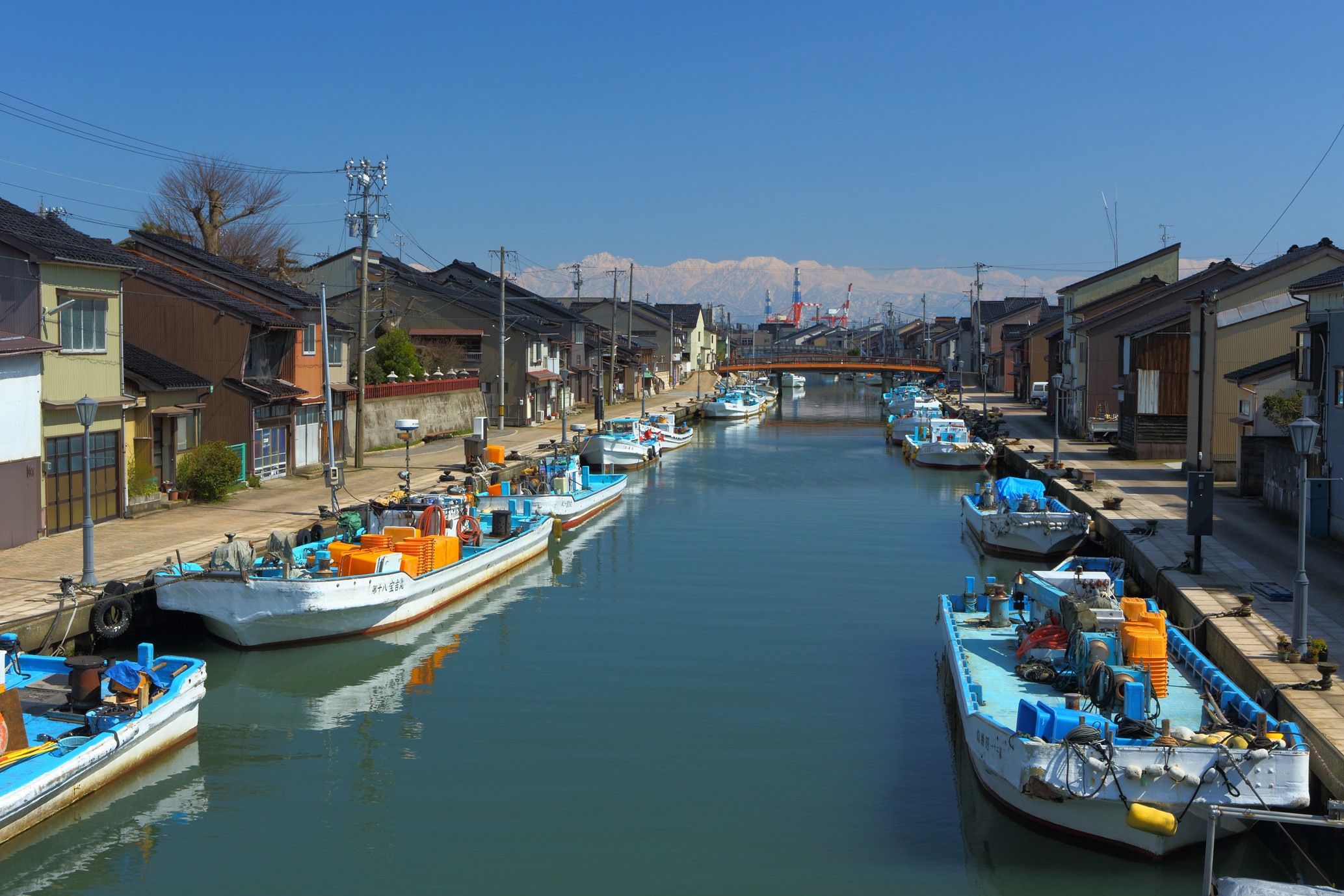 雨晴海岸は、富山県高岡市北部の海岸。能登半島国定公園に含まれ、日本の渚百選に選ばれている。 晴れた日には富山湾越しに3,000 m級の霊峰立山連峰の山々を望むことができ、運気が上がりそう!景勝地として人気がある。また、日本海に面した射水(いみず)市の内川周辺は、19世紀に北前船の中継地として栄えてきた港町です。川沿いには、かつての北前船主の蔵が残されています。川の両岸に漁船が連なって繋留されている風景は、どこか懐かしく、日本のベニスといわれており、近年映画のロケ地としても注目されています。「お宝を満載した北前線がやってきたぞ~!」ウキウキしそうで、益々運気が上昇しそうです。