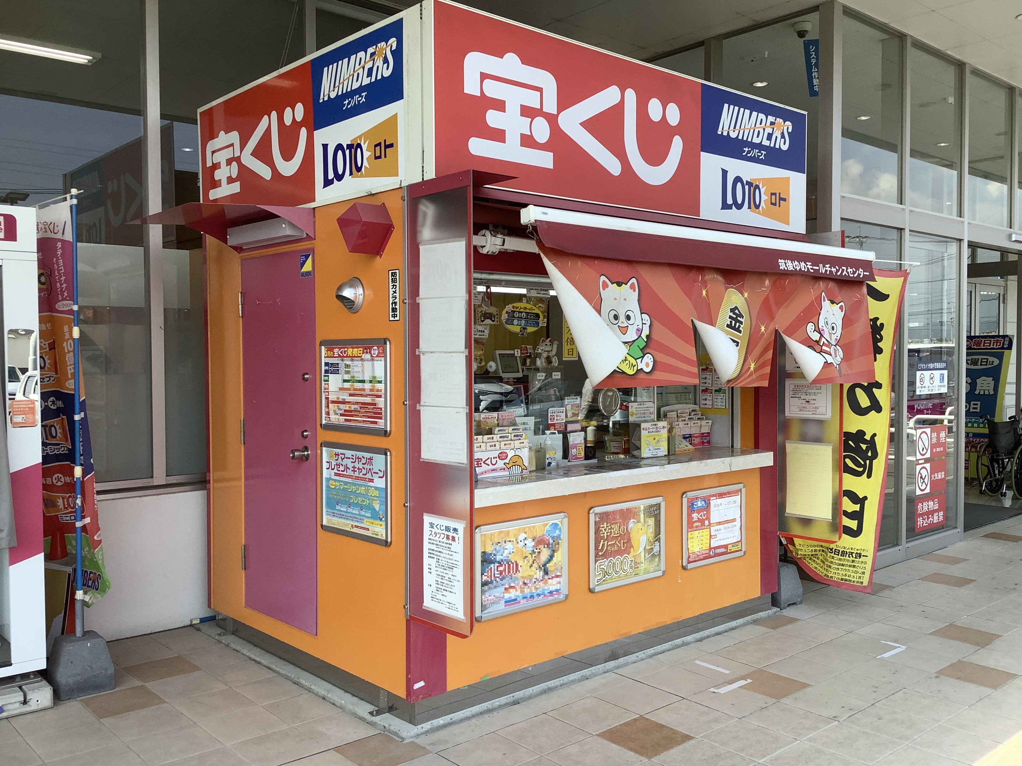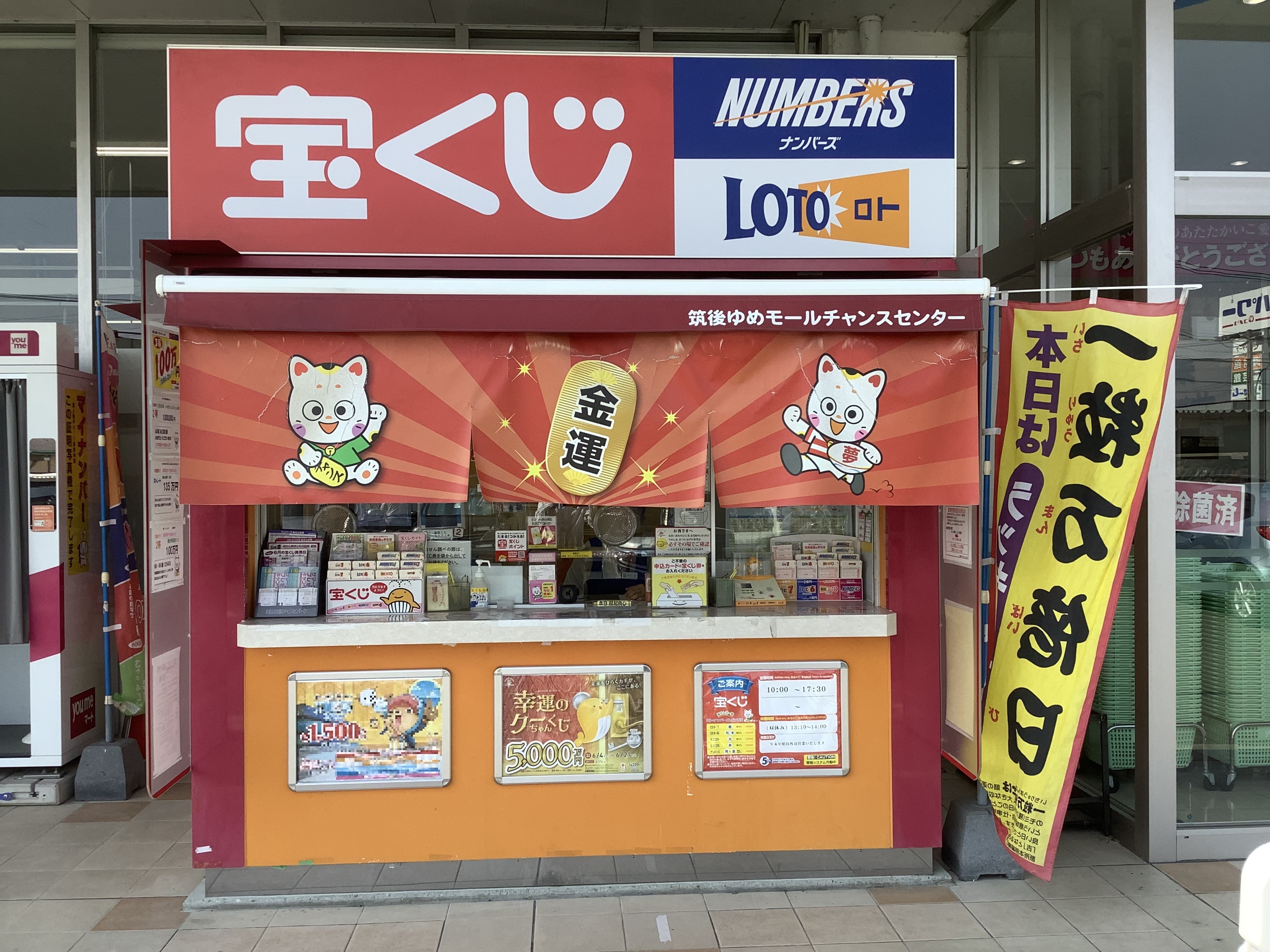 九州自動車道八女ICから約1km、国道442号線沿いのゆめモール筑後にある宝くじ売場です。売場がある筑後は恋の国。売場近くには、全国でも珍しい恋愛成就の神様を祀った恋木神社があり、その境内はハートのマークでいっぱいです。私たちの売場でも溢れんばかりの宝くじ愛で皆さまに素敵な夢をお届けしたいと願っています。宝くじが恋しくなったら当売場へお越しください。皆さまのご来店をスタッフ一同お待ちしています。