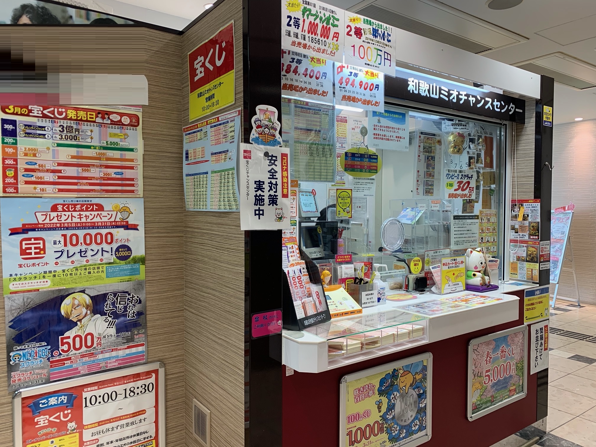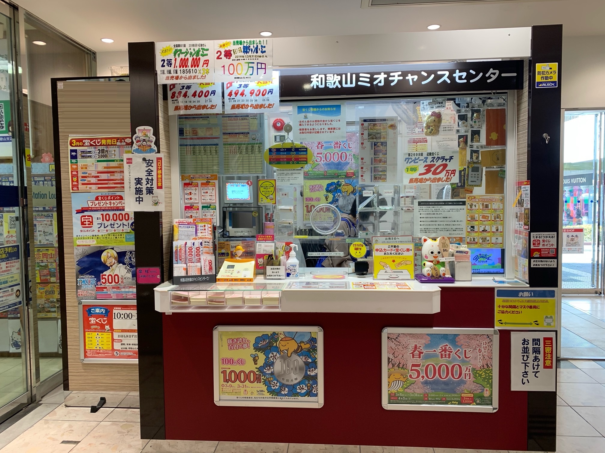 和歌山の玄関口、JR和歌山駅の駅ビル「MIO」の中にあるチャンスセンターです。 駅ビルの正面には、幸運・長寿が花言葉である欅(ケヤキ)並木が紀州徳川家の和歌山城へと続いている「けやき大通り」、駅裏には金運神社である「日前宮」と、開運エリアの中心に位置する当チャンスセンターへ 観光・ショッピング・通勤の行き帰りに、ぜひお立ち寄りください。