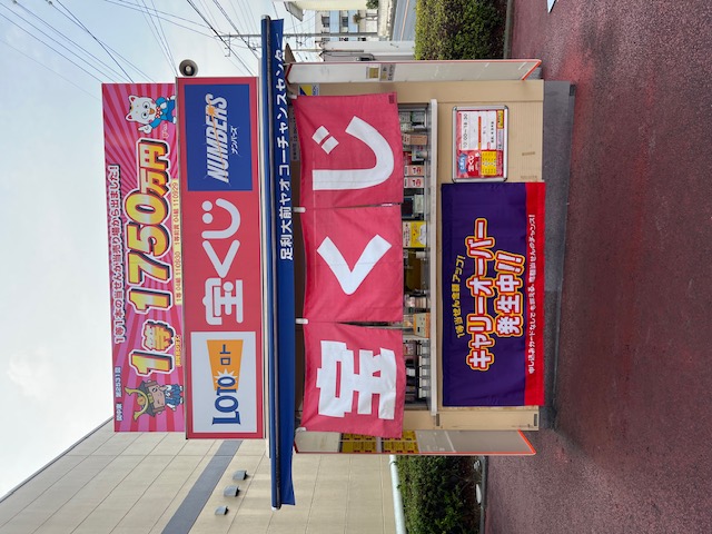「ヤオコー足利大前店」の横で販売中です。大きな当たりが出ますように心を込めて笑顔でお客様をお迎えします。皆様のご来店をお待ちしております。