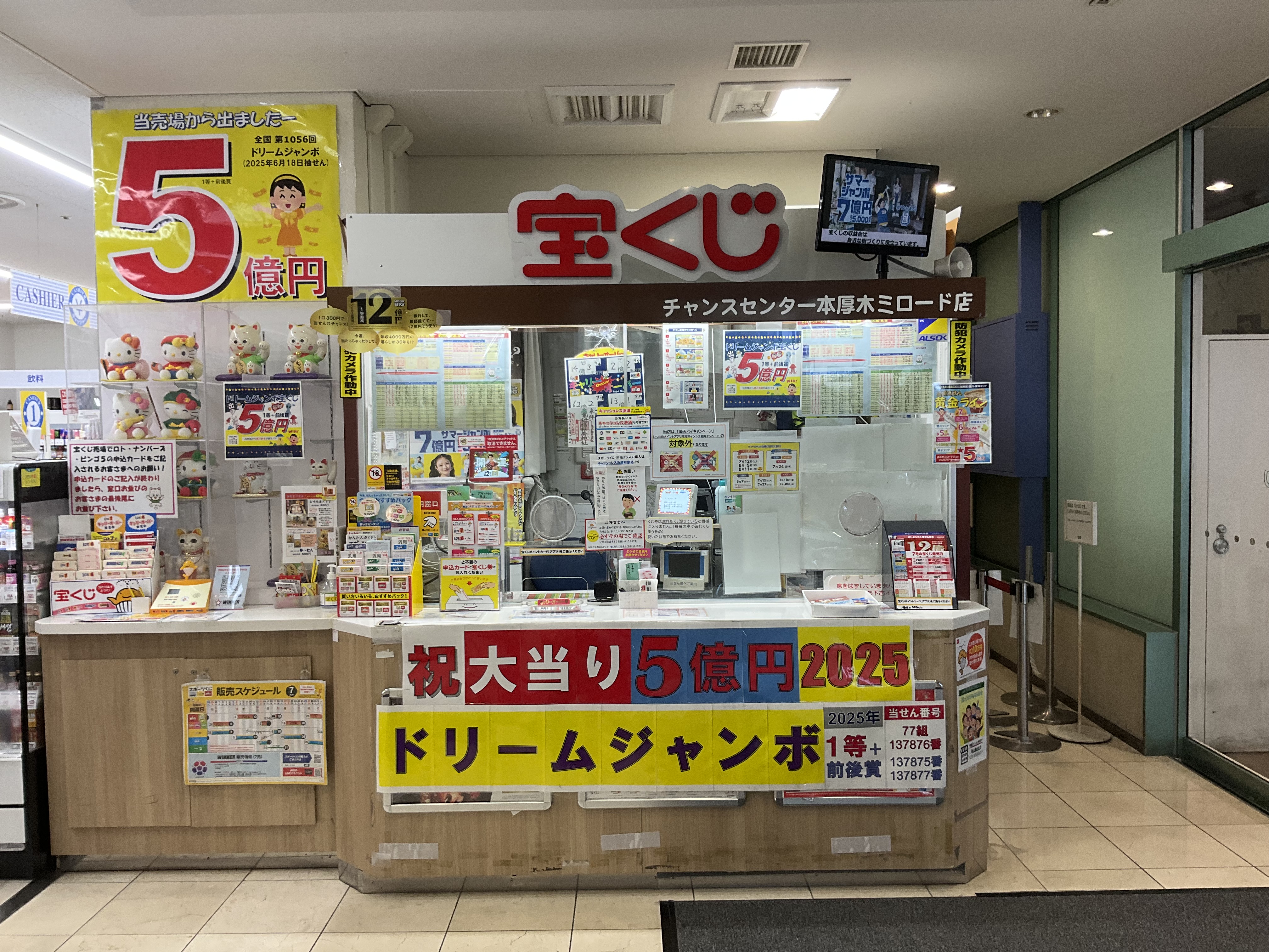 小田急線ロマンスカーも停車する本厚木駅の改札口出てすぐの売場です。幸運のパワーが集中している売場で、次なる億万長者を目指して皆さまのご来店を心よりお待ちしております。