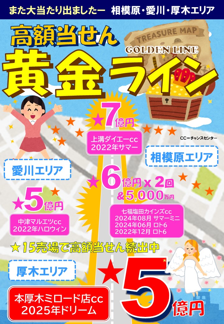 とうとう出ました!2025年6月抽せんのドリームジャンボで1等前後賞合わせて5億円。県内では、相模原市➡愛川町➡厚木市を結ぶ南北15㎞の「黄金ライン」に大当たりが連続して出ています。