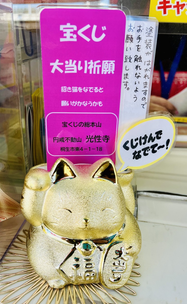 桐生市内には、宝くじの総本山と言われ、全国から多くの宝くじファンが訪れる 「円戒不動山 光性寺」 があります。光性寺のご住職に祈祷された「招き猫」は、福をたくさんもたらしてくれるといわれています。当売場でも 「黄金色の招き猫」 を授かり大当りを祈願しております。
