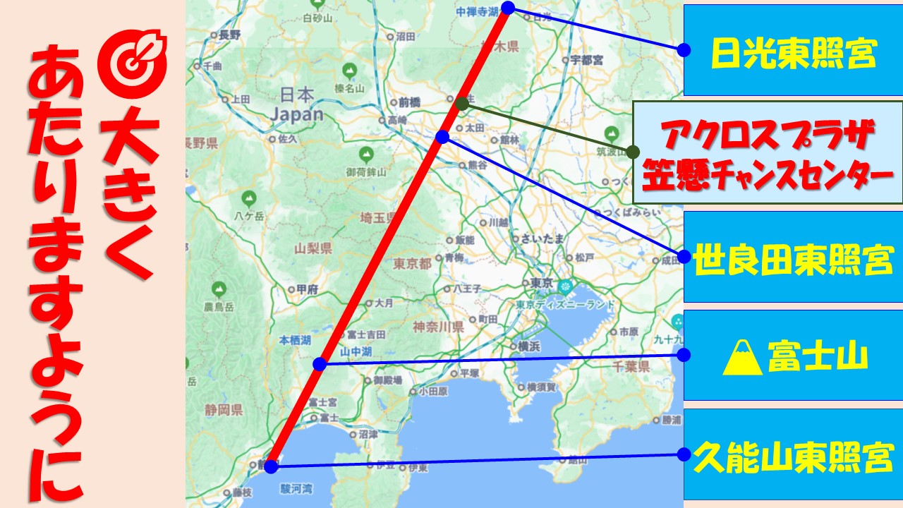 また、徳川日光東照宮~富士山~久能山東照宮(静岡)を結ぶ直線上には、ご利益のある強いパワーが流れているとも言われています。ここアクロスプラザ笠懸チャンスセンターもそのパワーの流れを受けて、運気上昇中です。