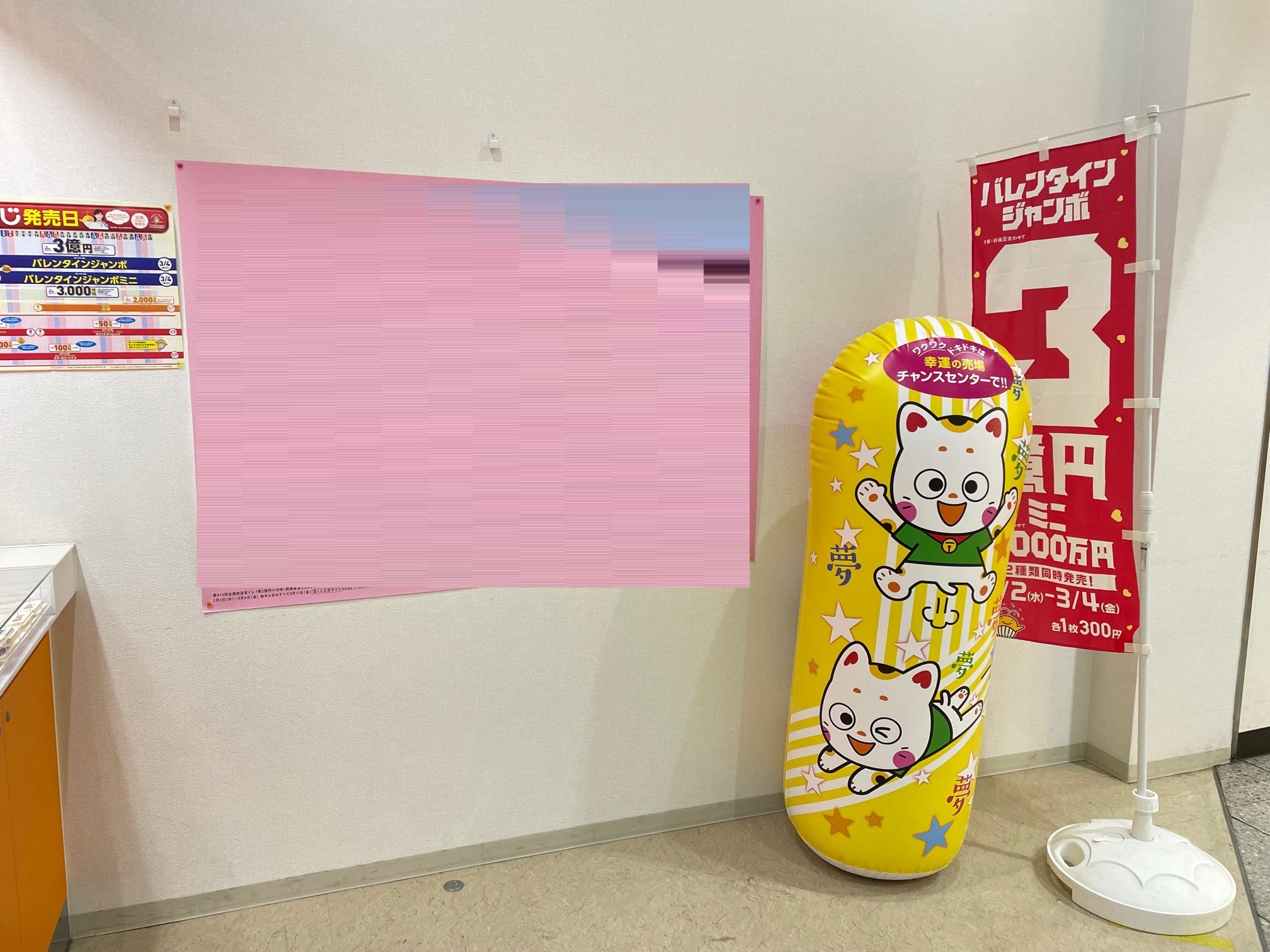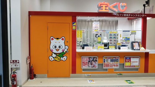 明るく開放的なスペースで落ち着いてゆっくり?宝くじを購入できる売場では、大きなパンチングPOPの「夢(む)~たん」が皆さまをお迎えしています。