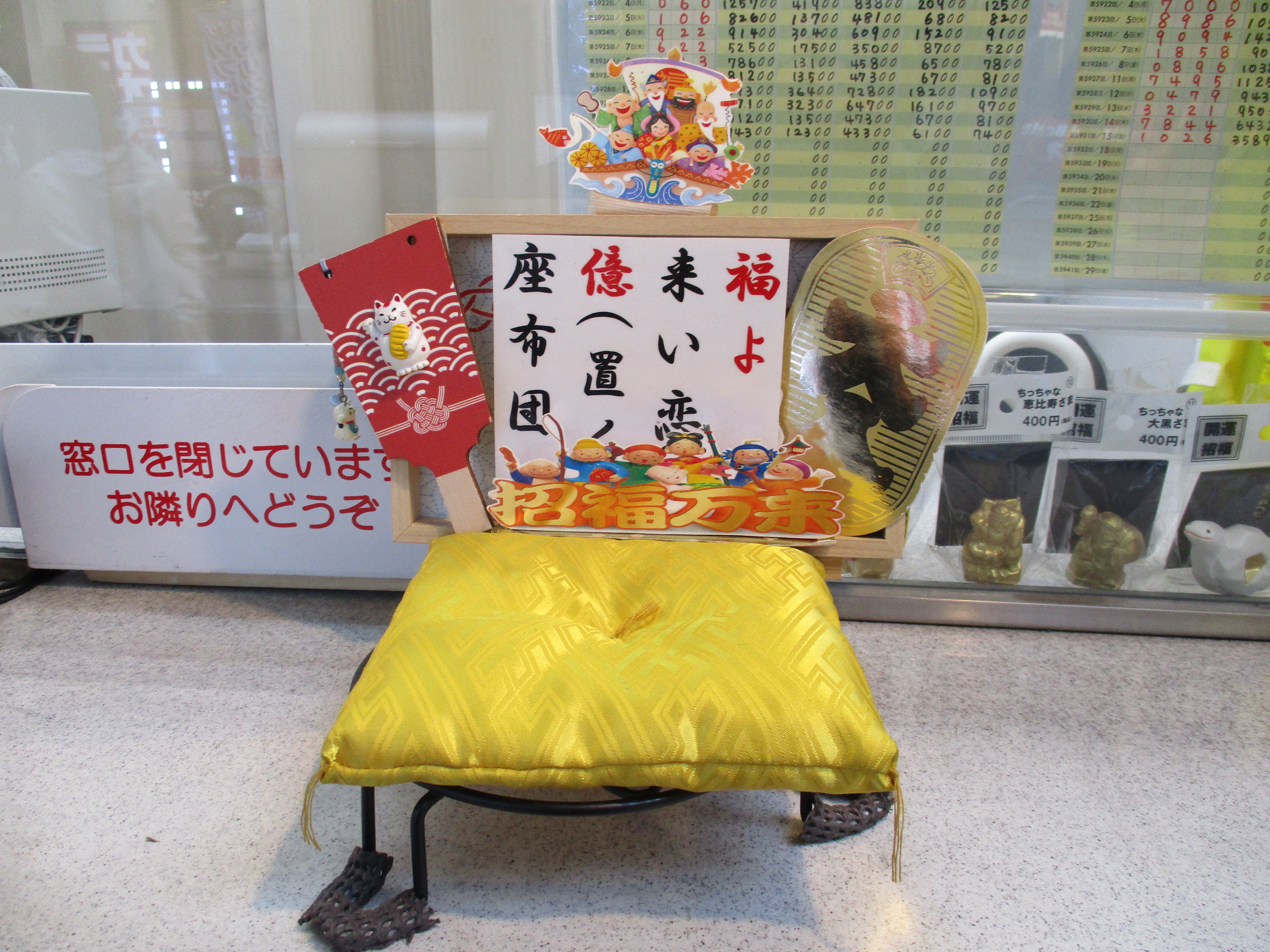 旧みずほ銀行蕨支店跡地にリニューアルオープン!蕨駅東口を出て徒歩1分!幸運の売場がまた一つ増えました。売場には億万長者が誕生することを願って『福よ来い恋、億(置く)座布団』を設置しました。御購入されたお客さまの億万長者誕生を心より願い、幸運の女神がご来店をお待ちしております。